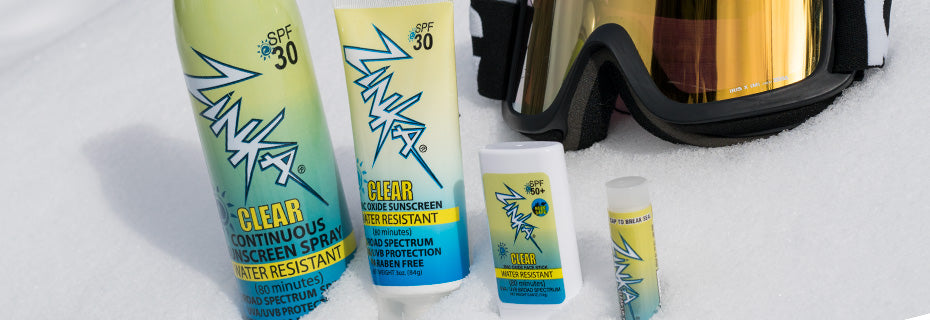 Zinka Clear Sunscreen provides UVA/UVB protection with zinc oxide, creating a barrier on the surface of your skin to keep you safe from the sun's rays. Our clear sunscreen is non-greasy and water resistant up to 80 minutes, providing long-lasting protection. Available as a face stick, spray, or lotion. We also offer clear lip balm with aloe, keeping your lips soft and protected from the sun.